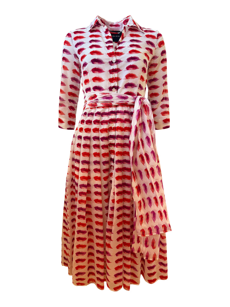 Pretty kisses in white and pink watercolour effect is the print on this summery cotton musola shirt dress from Samantha Sung. Comes with sash and matching belt, to be styled in alternative ways. 3/4 sleeve.