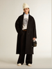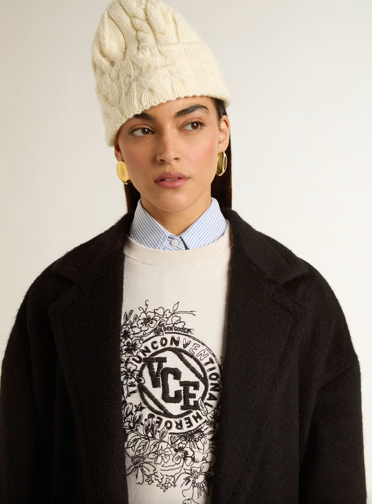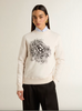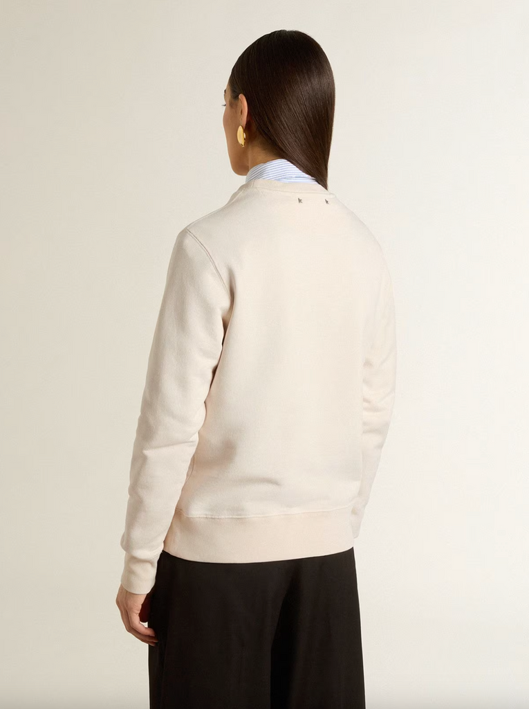 Worn white cotton sweatshirt with crew neck and black embroidery.