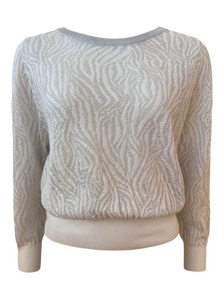 For those who love a little shimmer in their day, this beautiful light weight knit can be worn dressy or casual. White ribbed bands offset the silver/white wave design.