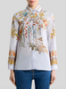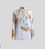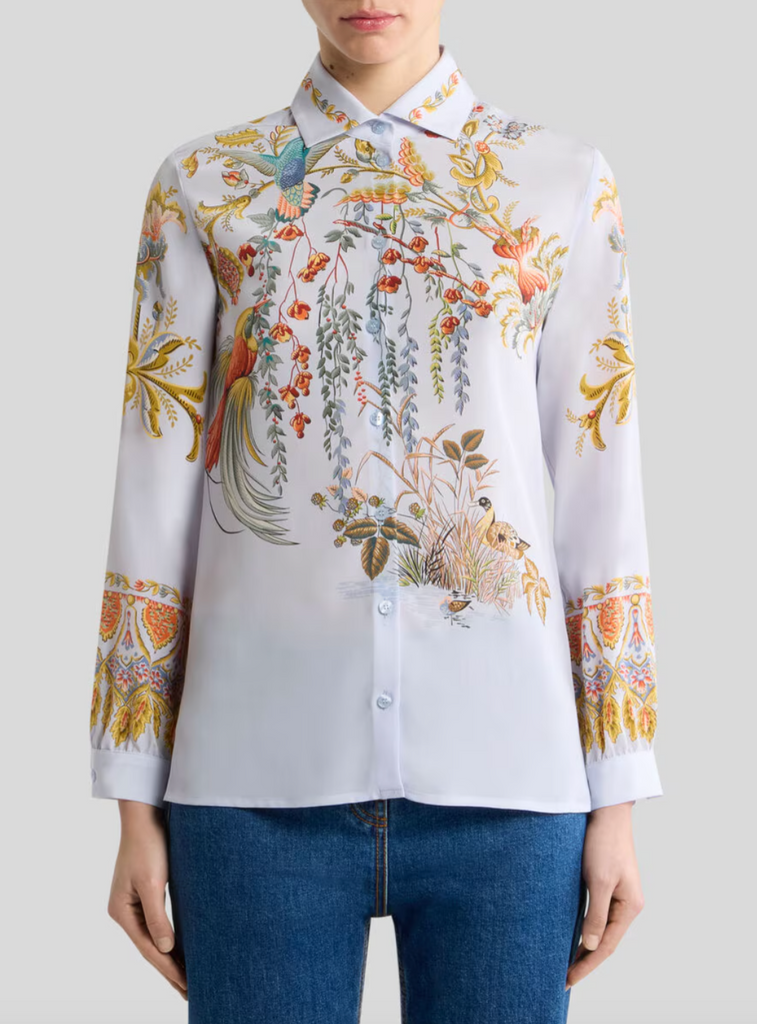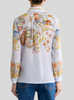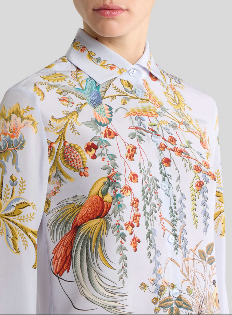 Pure silk crepe de chine shirt embellished with placed print inspired by natural flora and fauna on the upper part of the garment. The subtle floral motif on the collar and floral medallion motif on the sleeve ends complete the design.