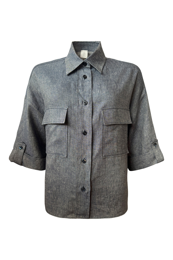 Oversized shirt with collar, front flap pockets and cuffed sleeves with tabs in soft denim linen blend. Light lurex effect.