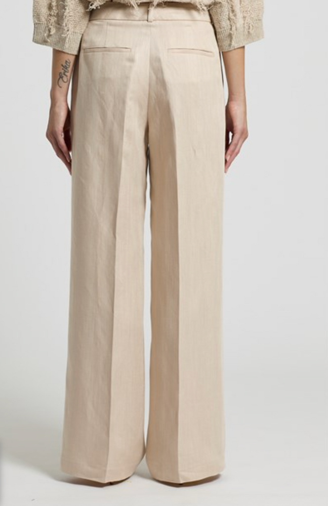 Palazzo pant. Front america pockets, back welt pockets.  Relaxed fit