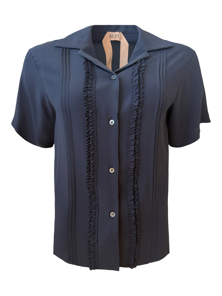 Navy Short Sleeve Silk Blend Shirt with Ruffle Front