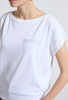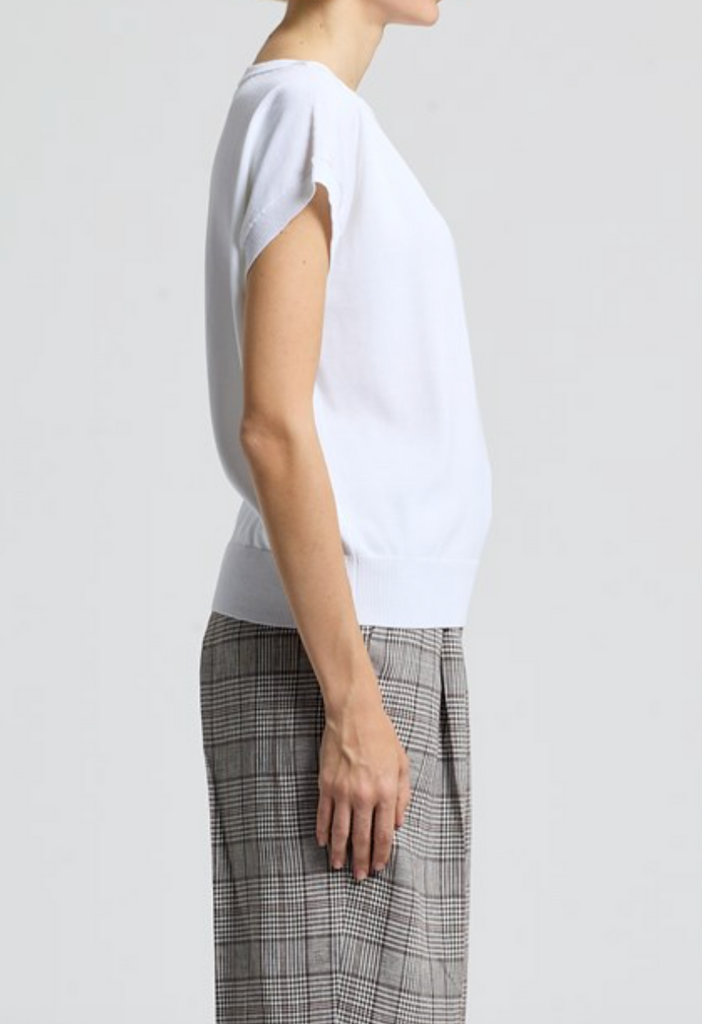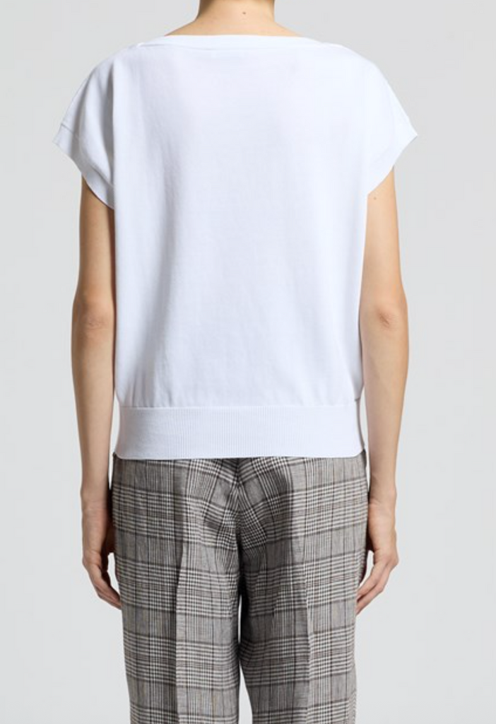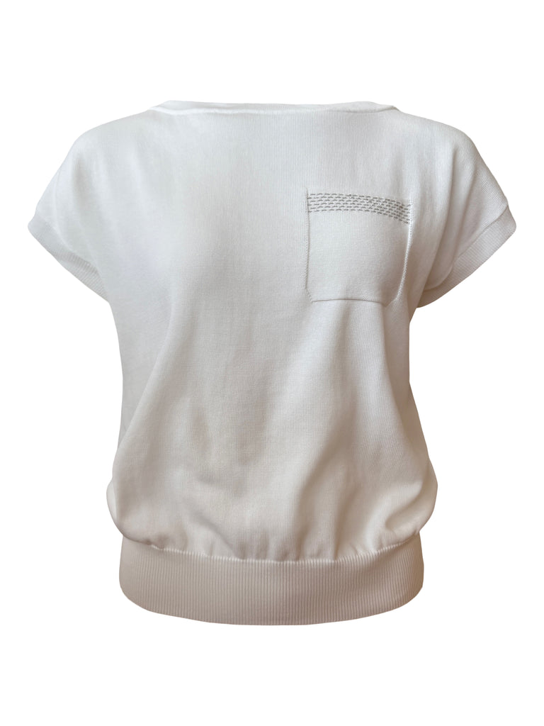 Sweater in crepe cotton yarn.  Boatneck collar. Kimono shoulders, sleeveless. Highlight details on knitted pocket. Ribbed finishing. Loose fitting