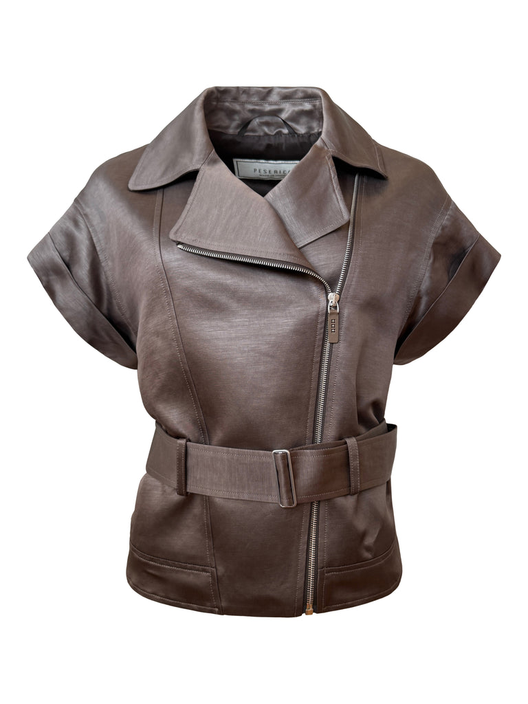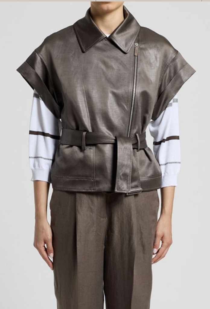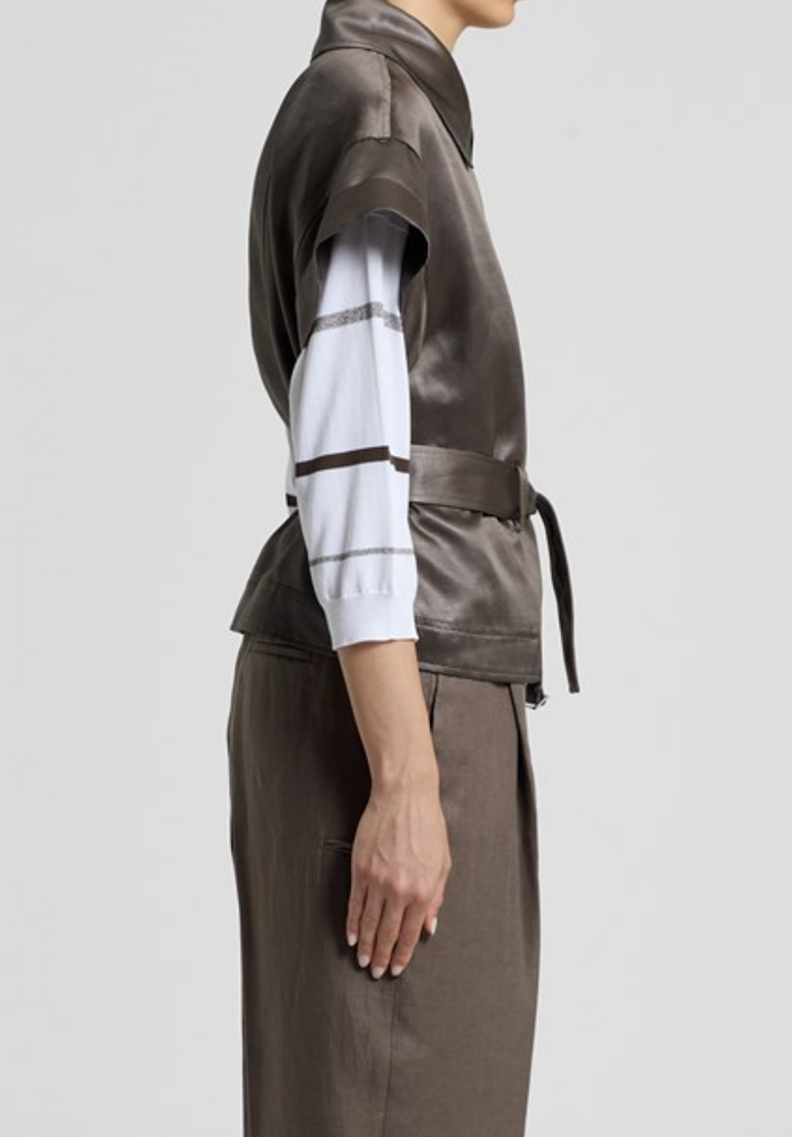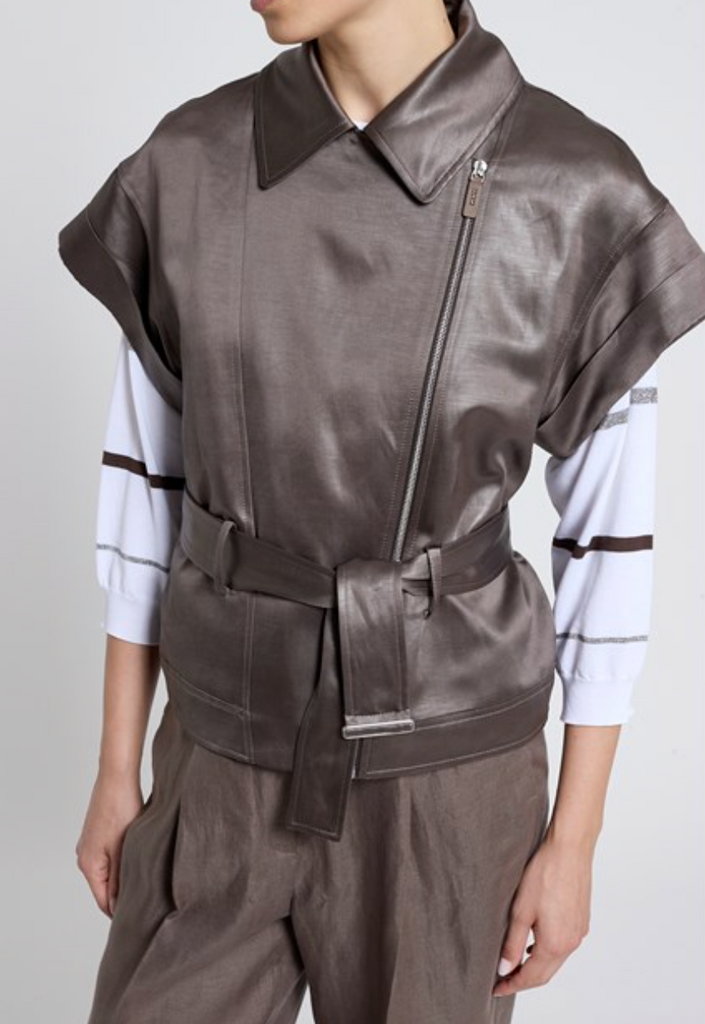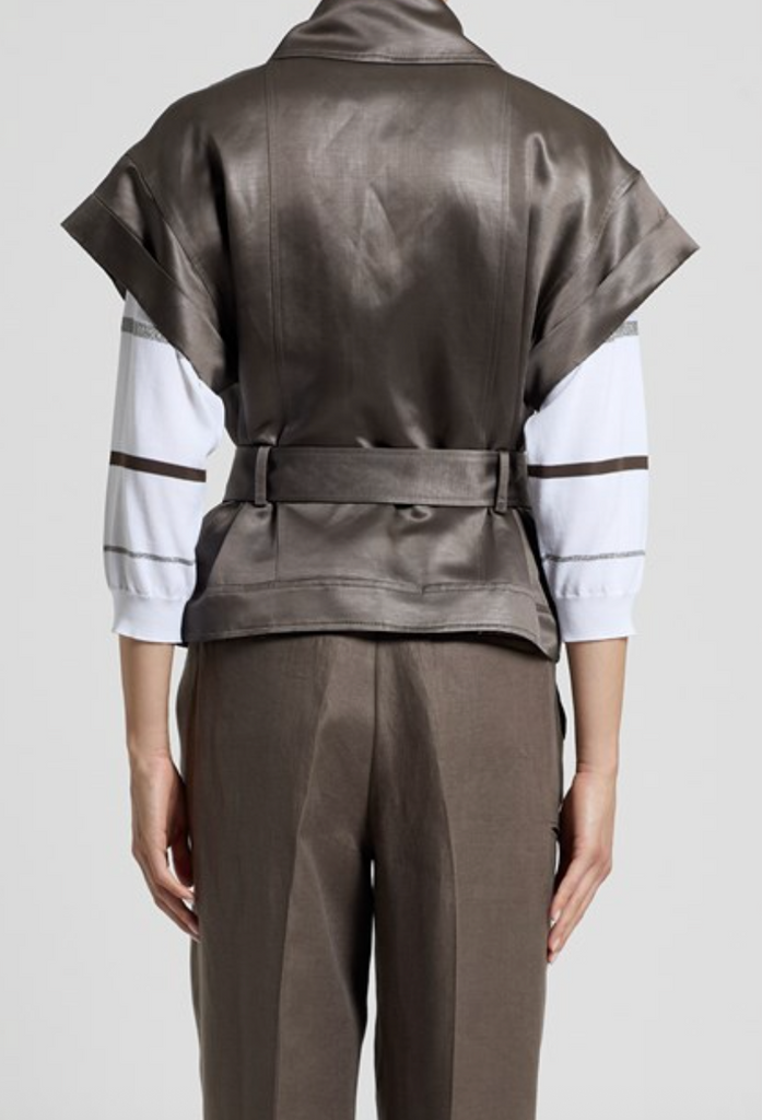 Double breasted waistcoat with classic lapel. Short kimono sleeves with flap. Woven belt and belt holes on waistline. Relaxed fit.