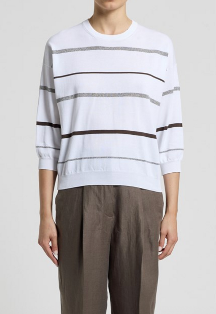 White 3/4 Sleeve Cotton Knit with Silver/Brown Stripes