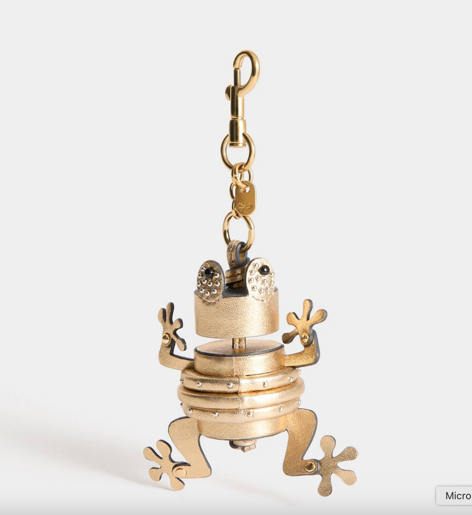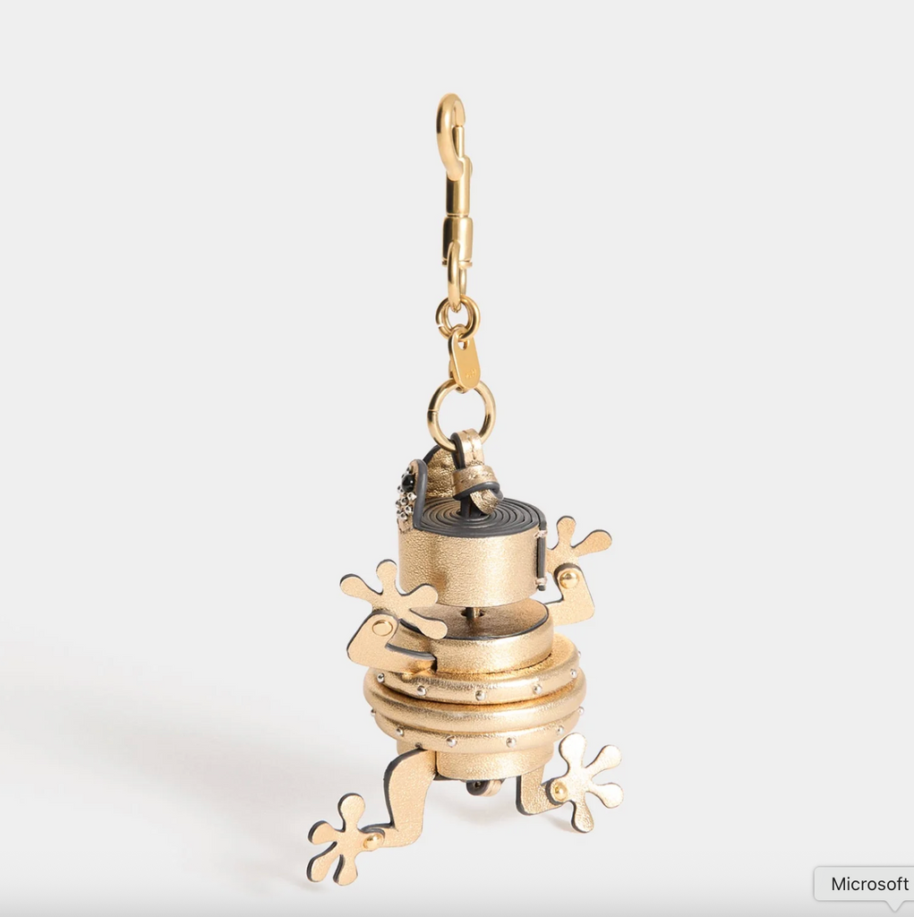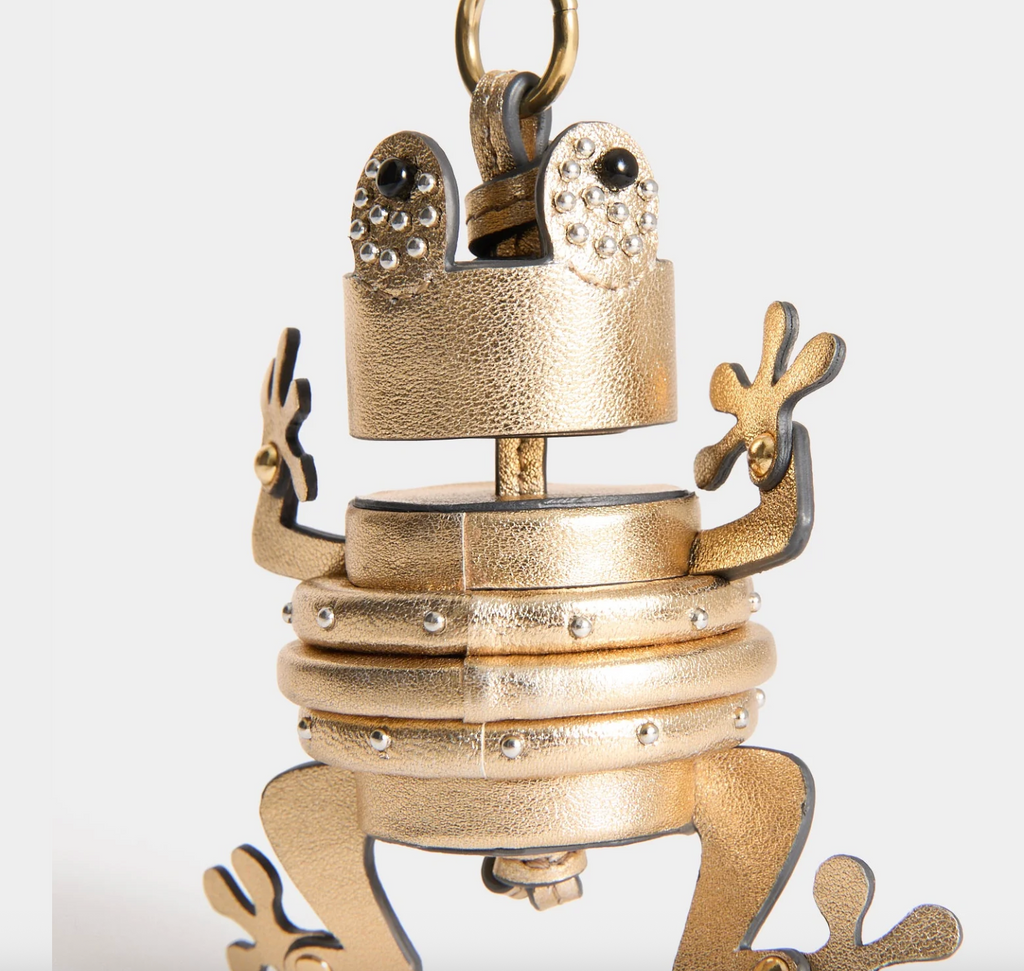 A perfect lucky charm, this little frog is intricately crafted from gold nappa leather – certified by the Leather Working Group – with articulated hands and feet, beaded eyes, and dainty stud embellishments. Attach it to a bag using the gold-tone clip.