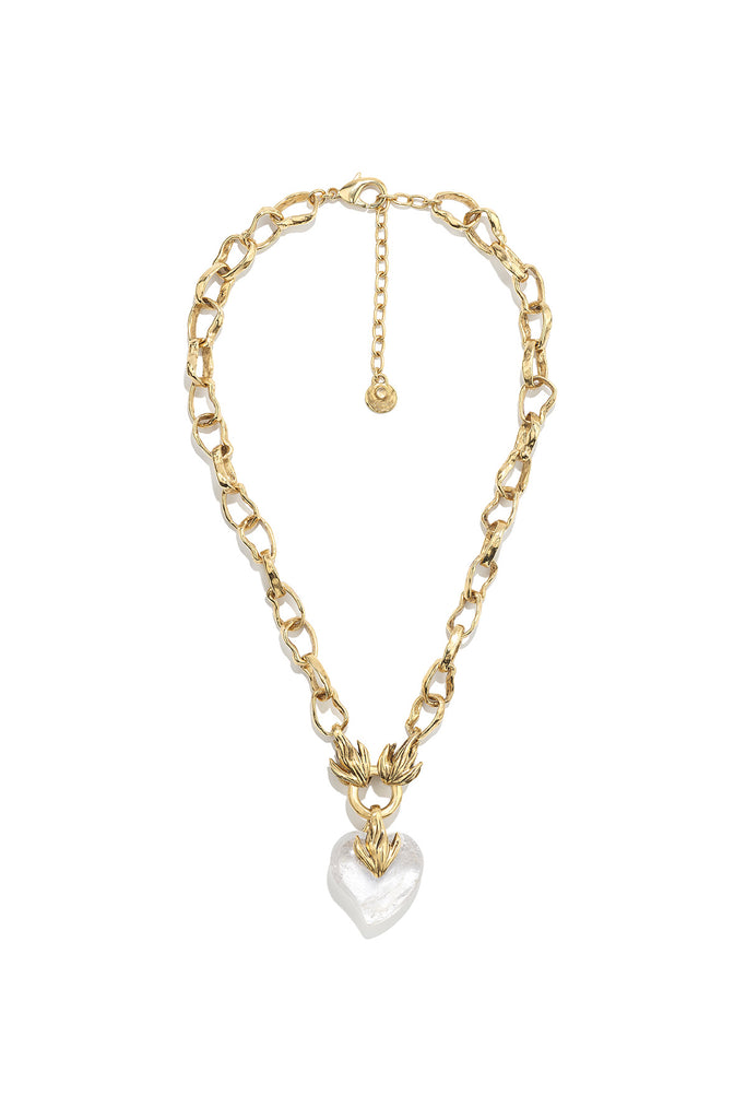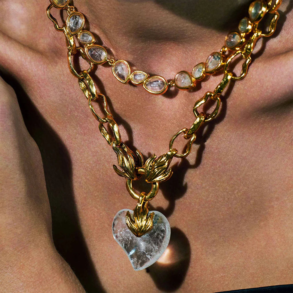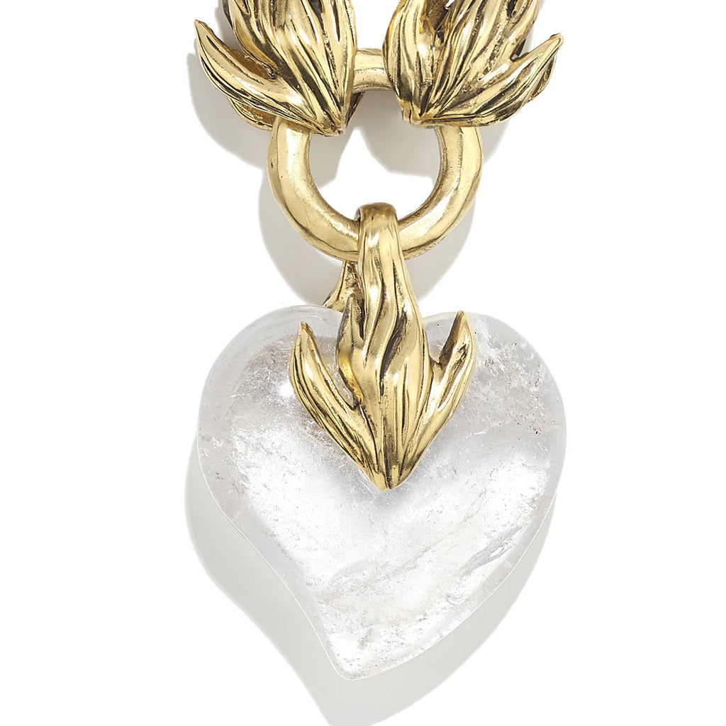 Necklace from the Coeur Précieux collection. Rock crystal heart mounted on a worked chain. A precious symbol of the House, the beating heart of Goossens. Rock crystal ignites and warms the stone hearts. An absolute heart-stopper. The natural inclusions in the crystal render each piece unique. All the stones are hand-cut especially for the House of Goossens.