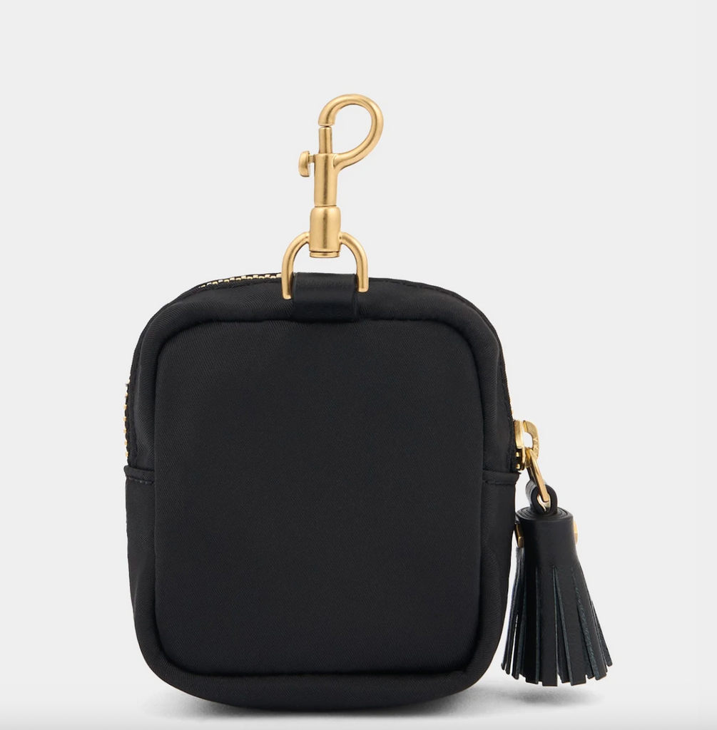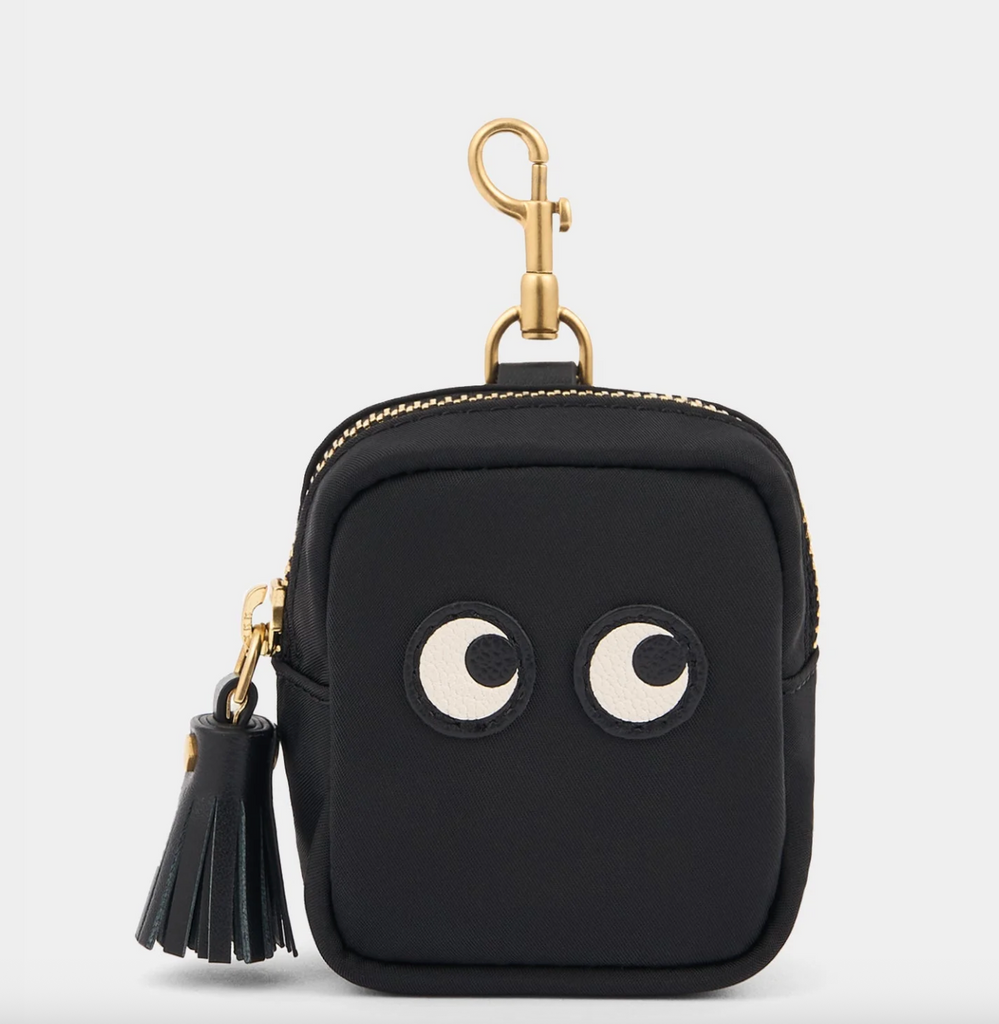 Keep ear pods safely stowed in our specially designed pouch. It's crafted from black ECONYL® regenerated nylon, appliquéd with leather eyes and finished with a tasselled zip and golden clasp – so you can attach it to the inside or outside of a bag.