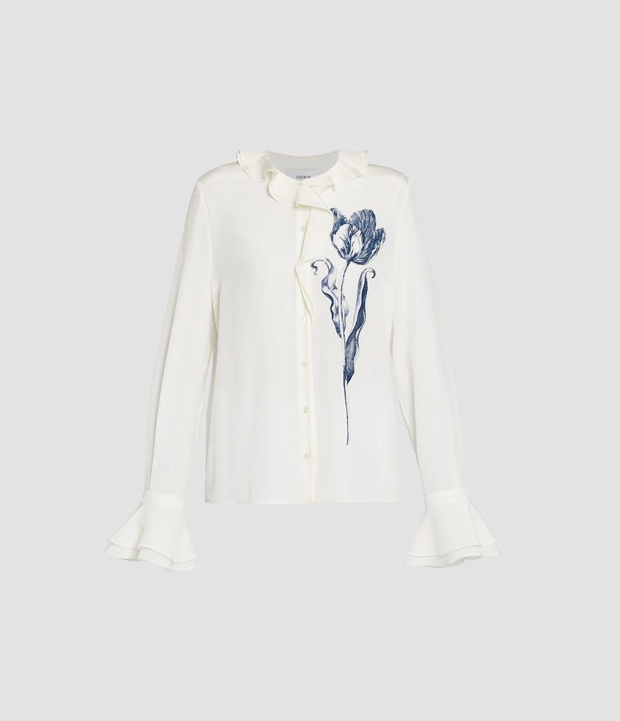 This shirt is cut from lightweight silk crepe de chine and printed with a single large tulip. The loose fit is defined by ruffled trims at the neckline and cuffs.