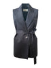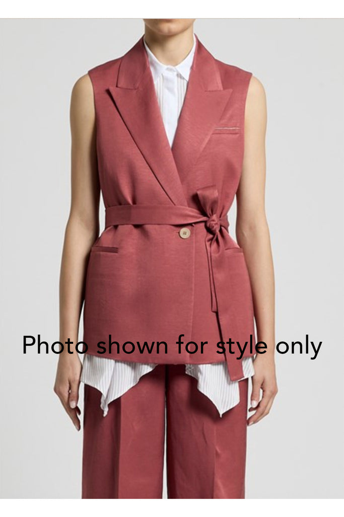 Double-breasted waistcoat with lapels. Welt pockets. Pocket with highlight details. Woven belt on waistline. Frontal closure with buttons.