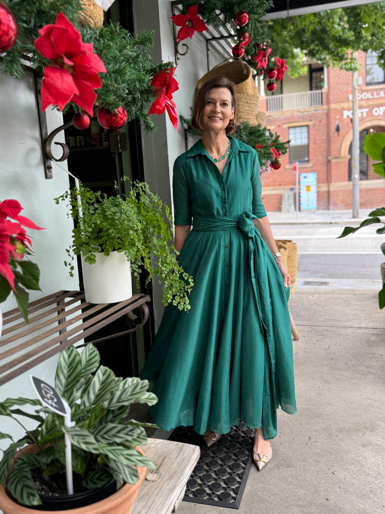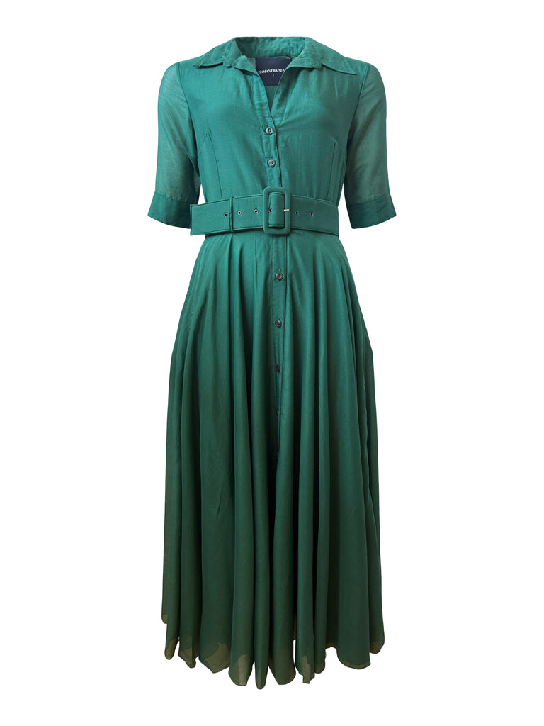 Seasonal ivy green is the colour of this cotton musola shirt dress from Samantha Sung. Comes with sash and matching belt, to be styled in alternative ways. Elbow length sleeve. Longer than a regular Samantha Sung dress. Maxi length.