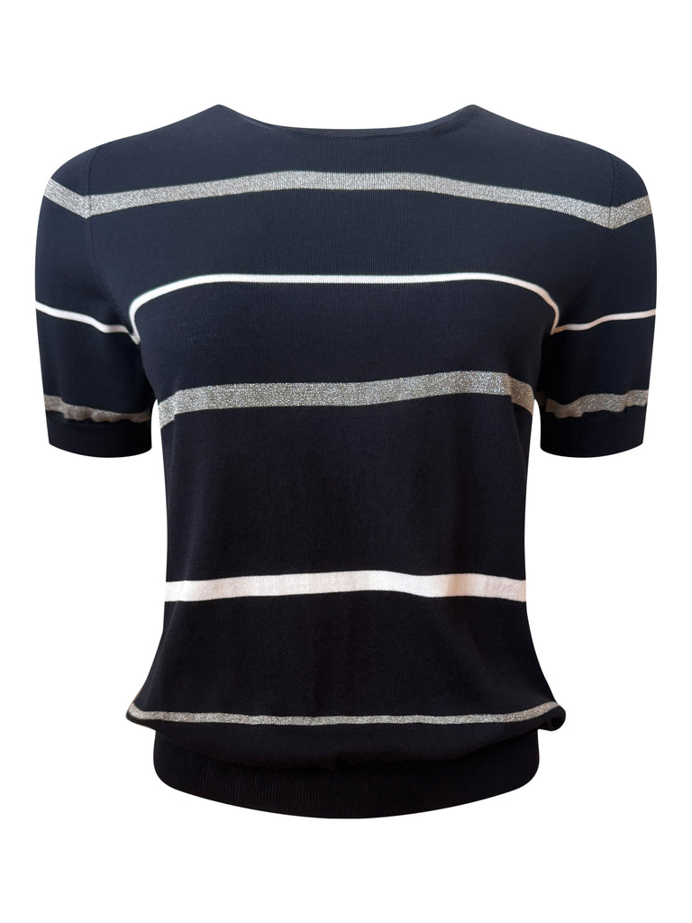 Sweater in crepe cotton yarn and lurex. Stockinette stitch with stripes. Round neckline and 3/4 sleeves