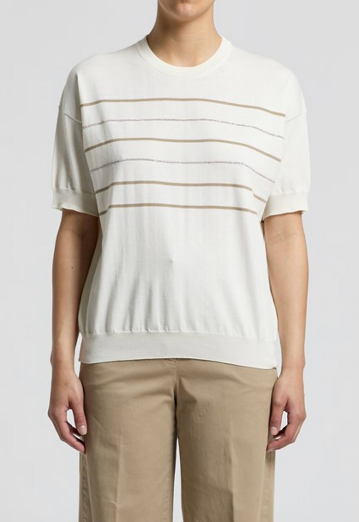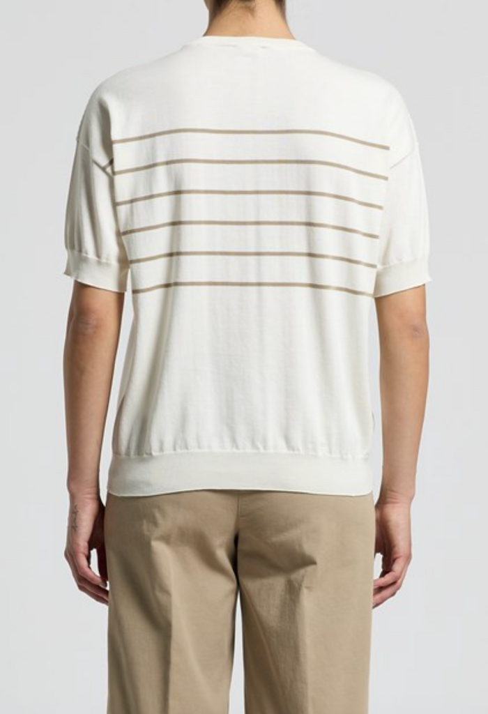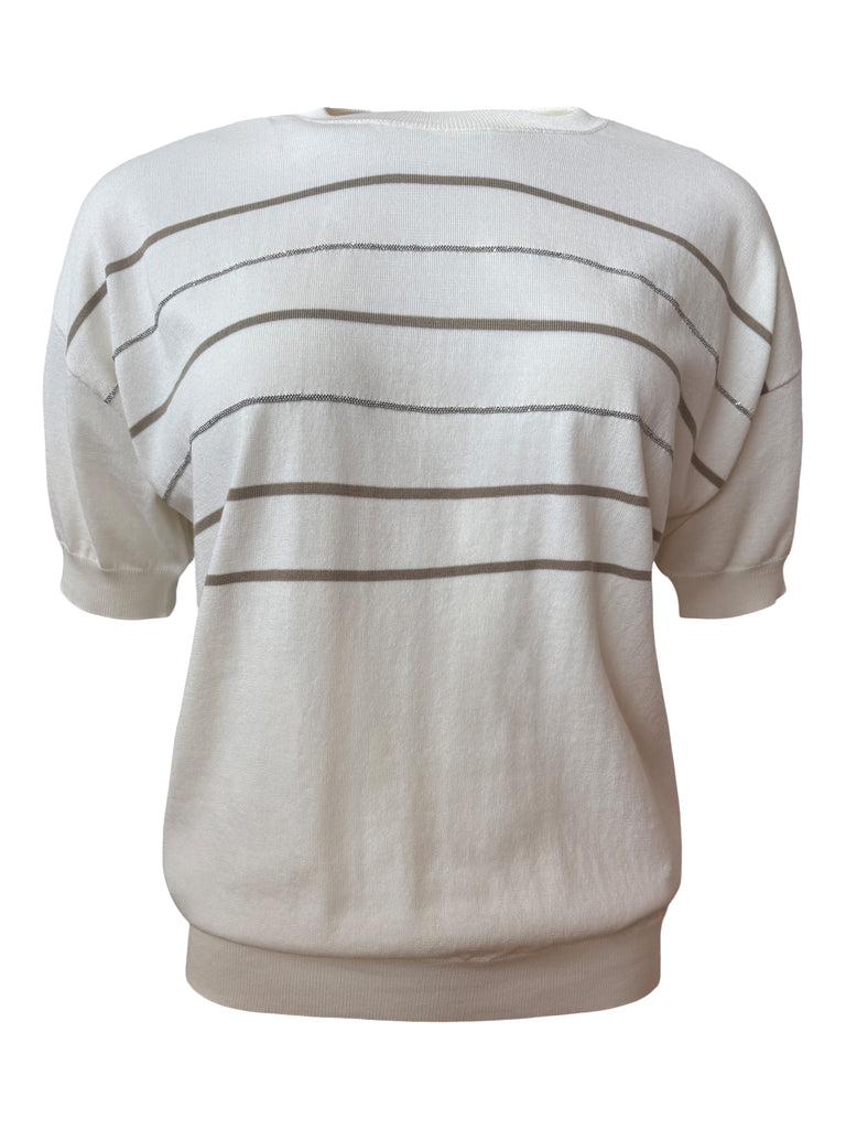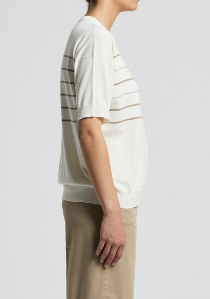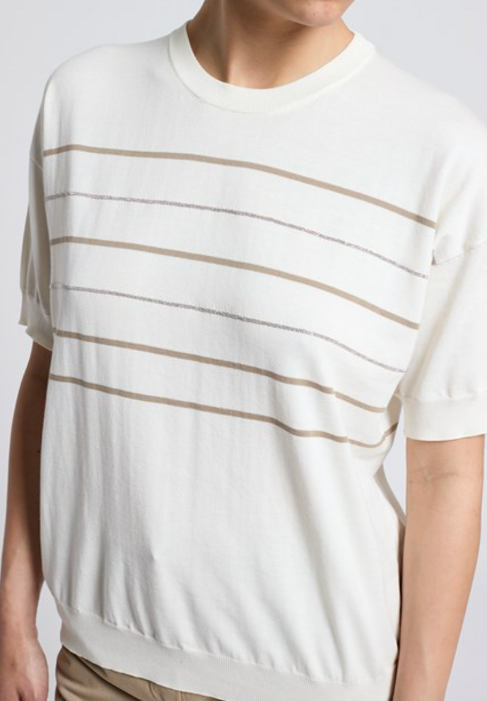 Short Sleeve Cotton Jumper in Natural White with Olive Silver Stripes