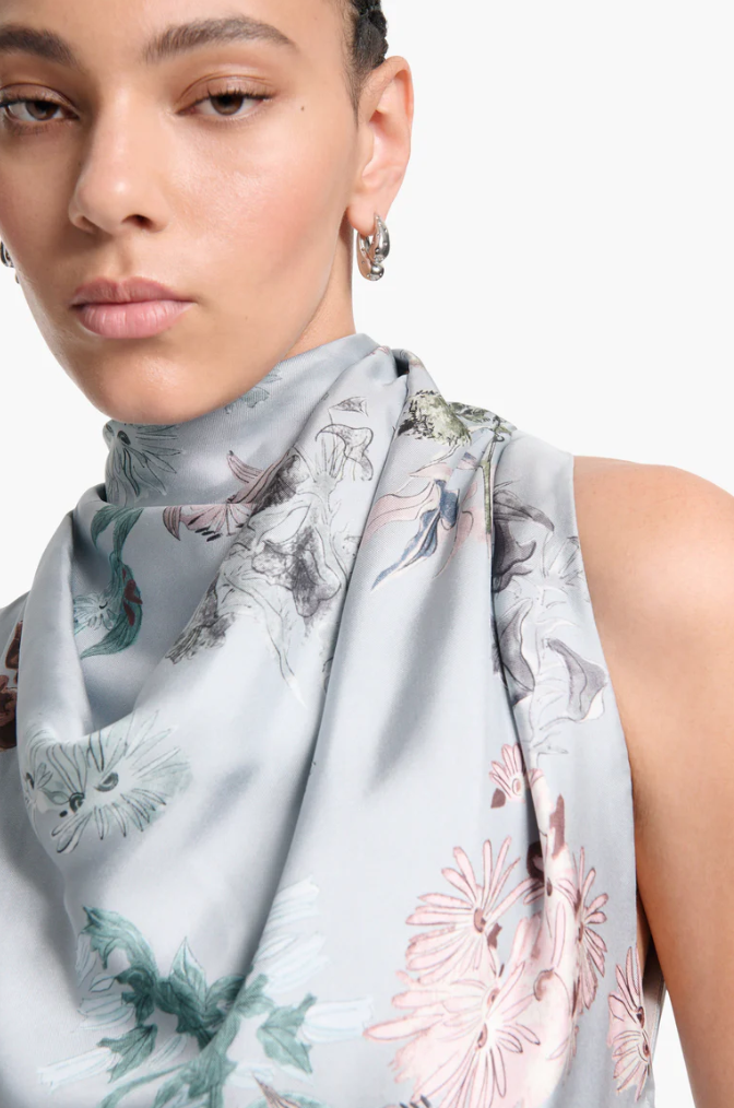 The Sleary top is crafted from luxurious silk with a cowl neck inspired by a scarf. The intersection of elegance and polish, it's finished with a feminine floral print.