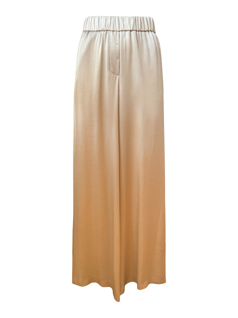 Palazzo pant with elastic waist. Inner side pockets and back welt pockets. Loose fitting