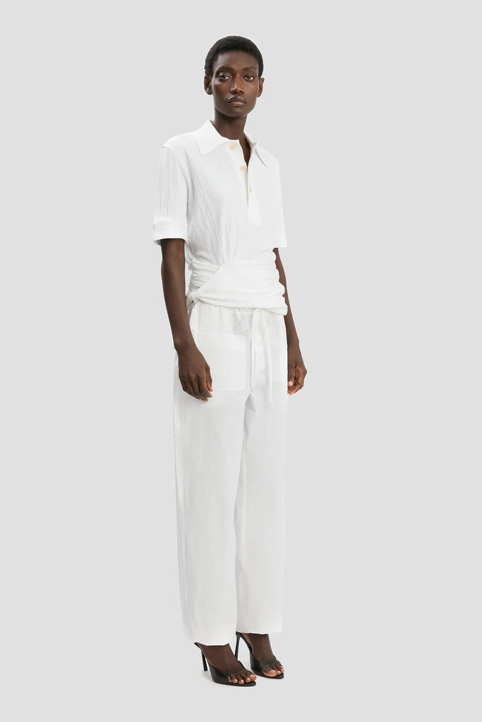 The classic polo top is reimagined with a tactile twist detail and asymmetric cut at the hemline. Crafted from organic ribbed cotton, the Twist Detail Polo Top in White has a traditional polo collar with buttons and is finished with an embroidered Victoria Beckham monogram at the centre back neckline.