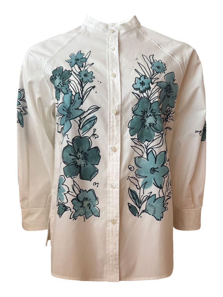 Loose fit cotton blouse with flower print on the front and sleeves. Meo collar.