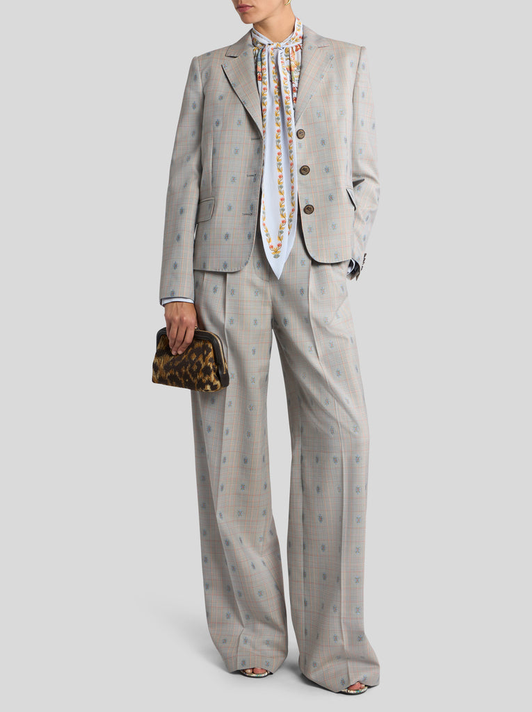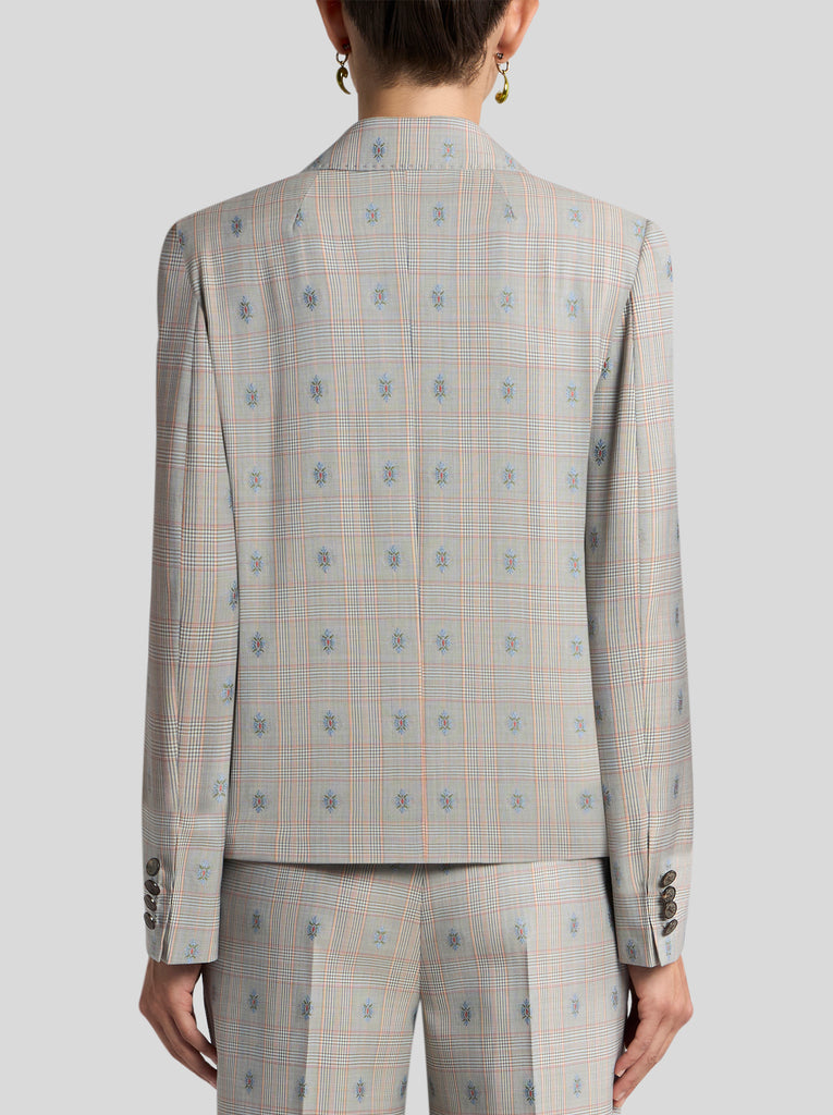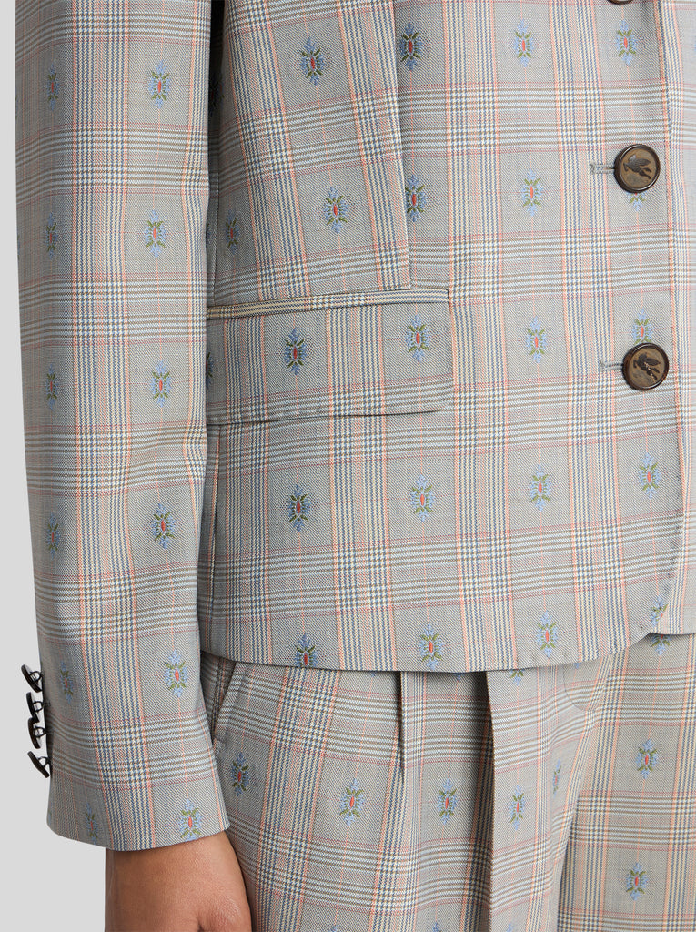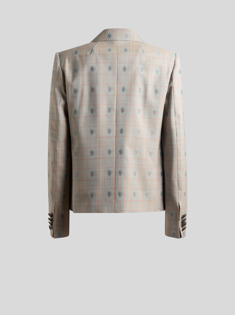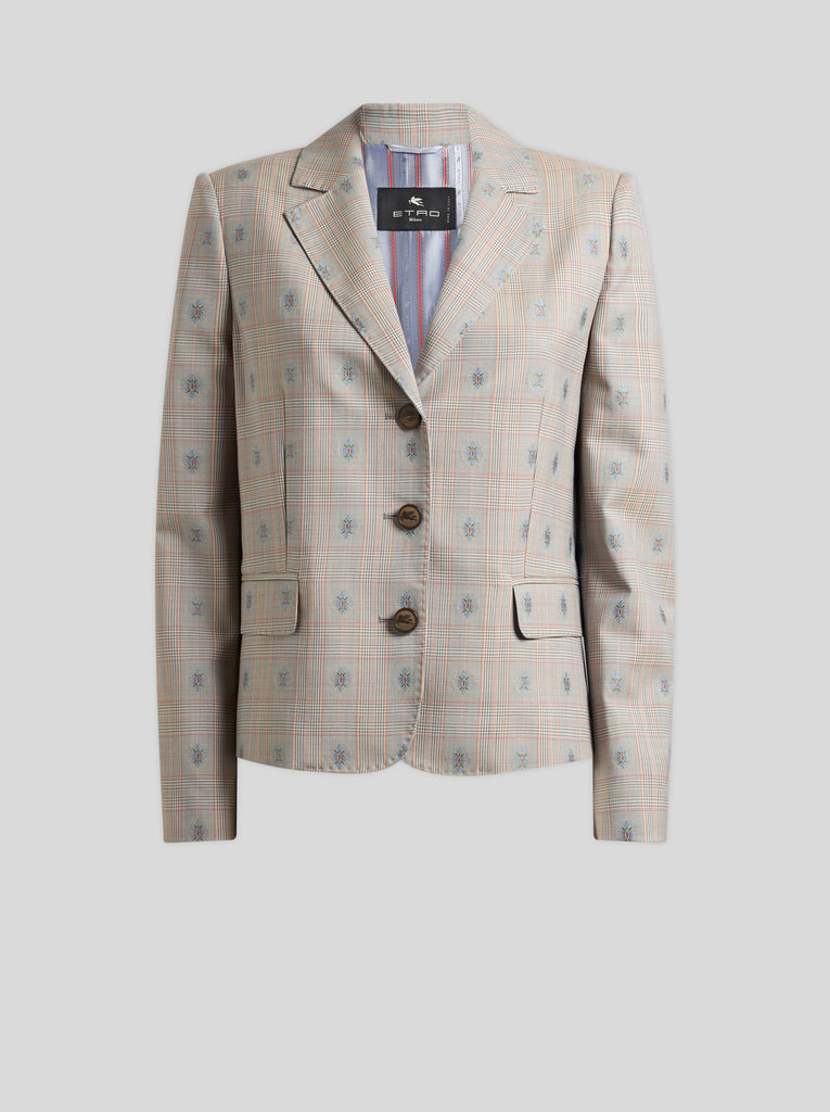Wool blend single breasted boxy jacket with flap pockets. Fine check with flower motif.